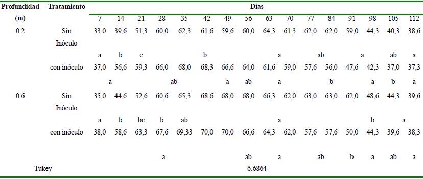 El registro de la temperatura a las profundidades seleccionadas aparece en la Figura 1, para las pilas sin estiércol vacuno y con dicho inóculo. En ambos casos, se muestra la sucesión de las fases propias de la degradación bioquímica de la materia orgánica fermentable, que tuvo lugar durante el compostaje; esa tendencia fue independiente de la profundidad a la que se tomó el dato correspondiente; los valores de la medición a 0.20 m resultaron inferiores por tratarse de la zona más superficial de las pilas, aspecto que corrobora la importancia del volteo, para garantizar la homogeneidad de la biotransformación y la calidad de su resultado 28-30 y favorecer la actividad de las oxidasas producidas por los microorganismos descomponedores y lograr temperaturas uniformes en la masa en transformación, lo que se expresa en la calidad y uniformidad del producto final 31.