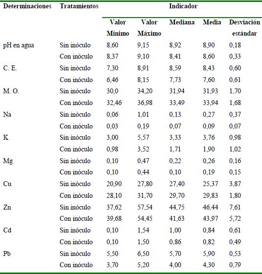 A los resultados obtenidos en los dos momentos en que se realizó el estudio se les determinó la media. Las muestras de estiércol y la temperatura, fueron procesadas para el cálculo de valor promedio y desviación estándar; los datos de las muestras de RMA, de pilas de compostaje y de compost, se procesaron para cálculo de rango, mediana y media de las siguientes variables: pH, conductividad eléctrica y contenidos de materia orgánica, fósforo, potasio, magnesio, cobre, cinc, cadmio y plomo.