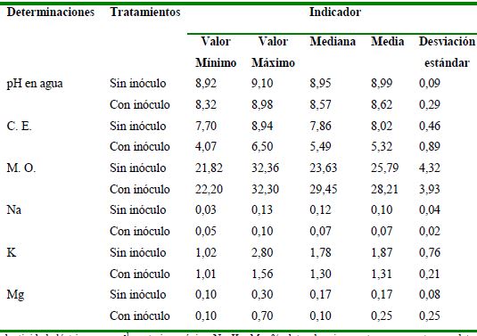 Finalmente, si bien la discusión anterior se ajusta a la información mostrada en la Tabla 4, no resulta ocioso comentar que las diferencias entre ambos tratamientos, se debe al efecto de la adición de estiércol a los RMA al momento de conformar las pilas de compostaje, lo que al parecer supuso por su magnitud ~20 % de la cantidad total~ un efecto de dilución que dio lugar a la disminución de la concentración de algunos elementos químicos y con ello, de la conductividad eléctrica.