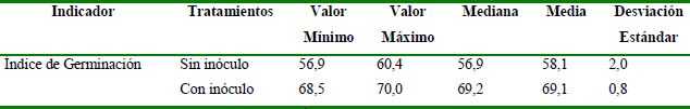 En cuanto a la fitoxicidad, en la Tabla 7 se aprecian los resultados de la prueba de germinación conducida con Raphanus sativum L. Ambas compostas (tratamientos A y B) presentaron fitotoxicidad moderada, según la gradación propuesta por 23, si bien la composta producida según la variante B, se caracterizó por una mejor respuesta, de acuerdo con el rango establecido por los autores para la evaluación y que admite valores desde 50 % hasta 80 % para esa categoría del indicador.