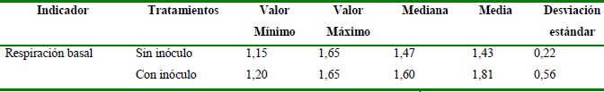 En la Tabla 8 se muestra el resultado de las pruebas de respiración basal realizadas a las muestras de las compostas obtenidas en los tratamientos A y B. Esta prueba se aplicó como indicador o criterio de terminación del proceso de biotransformación donde valores < 2 mg CO2∙g de muestra-1 corresponden a una reducción notable de la actividad microbiana, asociable al cese del compostaje y por extensión, a la maduración o estabilización biológica del compost 45.