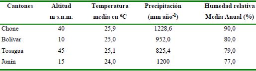 De acuerdo a las estaciones meteorológicas que existen en Chone y Tosagua (La Estancilla), para un período de 30 años y la ubicada en Calceta (ESPAM MFL), 21 años, los cantones involucrados en el área presentan los datos promedios anuales que se muestran en la Tabla 1.