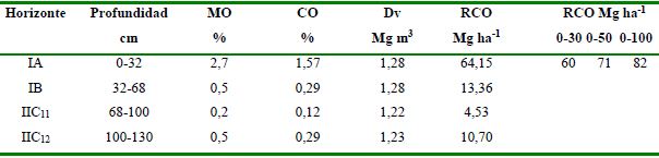 Reservas de carbono orgánico (en toneladas de carbono por hectárea) de la capa de 0-20 cm de cada uno de los perfiles estudiados por la fórmula internacional:
