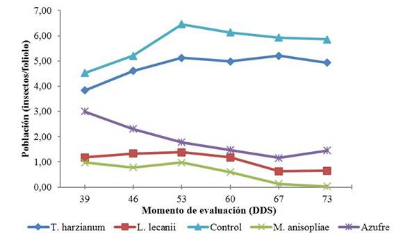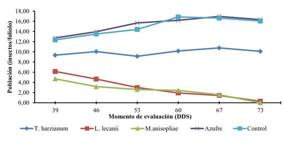 En la sexta evaluación, se destaca Metarhizium como el mejor tratamiento, con diferencias significativas, respecto al resto; por su parte, Lecanicillium mantuvo un efecto positivo sobre las poblaciones de insectos, con diferencias significativas en relación con el azufre, mientras que Trichoderma y el control no presentan diferencias significativas entre ellos.