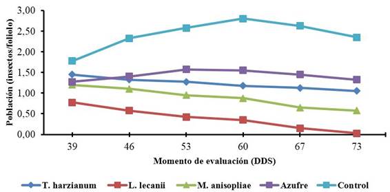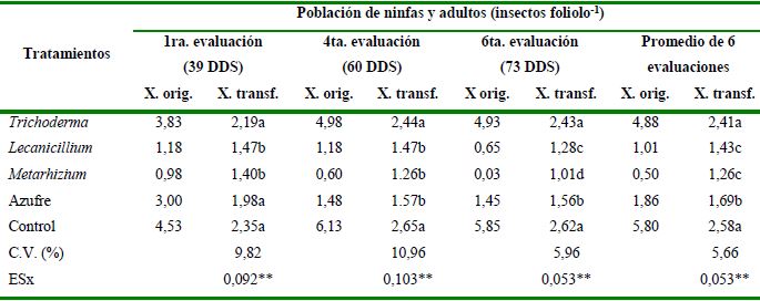 Por otra parte, en la cuarta evaluación los tratamientos de Lecanicillium, Metarhizium y Azufre mostraron el menor número de insectos por foliolos con diferencias significativas con respecto al control.