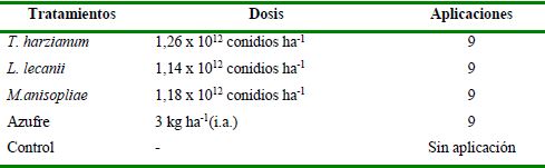 Para la aplicación de los productos se utilizó una mochila de espaldas, manual, con una capacidad de 16 L y una descarga de 300 L ha-1, realizando los ajustes necesarios para, lograr la dosis requerida.