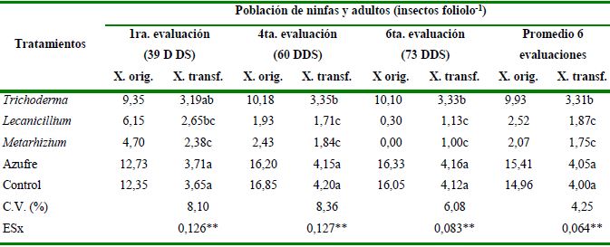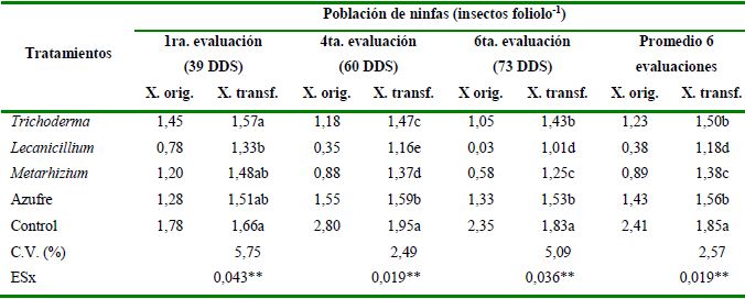 El análisis estadístico realizado con los datos de 1ra., 4ta. y 6ta., independiente y el promedio de las seis evaluaciones, mostró que existen diferencias altamente significativas entre los tratamientos. Como se puede apreciar en la la Tabla 4 desde la primera evaluación, a los 39 días Lecanicillium redujo la población de ninfas de B. tabaci; mientras que el resto de los tratamientos no difirieron del control.