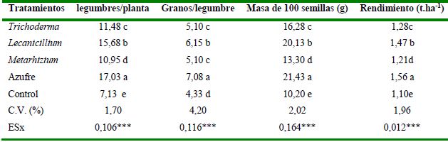 En cuanto al componente legumbres por planta se obtuvo que todas las variantes difieren estadísticamente entre ellas, con el mayor valor en el caso de los tratamientos con Azufre, seguido de Lecanicillium. En el caso de los granos/legumbre no resultó igual, pues, aunque se mantuvo en el mismo orden entre esos últimos tratamientos, resultaron similares estadísticamente los valores correspondientes a los dos restantes hongos. El ordenamiento en el componente masa de 100 granos fue similar al del número de legumbres por planta. También se obtuvo una tendencia similar en las distintas variables en el caso del rendimiento estimado.