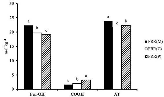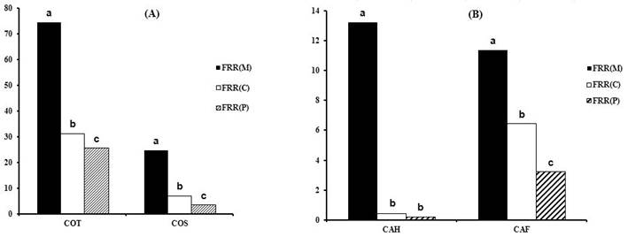 Con respecto a los contenidos de carbono orgánico total (COT), de carbono orgánico soluble (COS), en forma de AH (CAH) y en forma de AF (CAF) en los sitios estudiados con diferentes usos agrícolas, se registró una disminución considerable en FRR(C) y FRR(P) con respecto a FRR(M) (Figura 2).