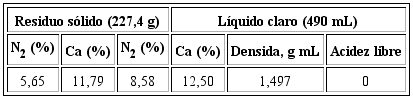 En la Tabla 2 se observa que existe cierta cantidad de nitrato de calcio en el residuo sólido, aunque con valores inferiores a la del líquido claro.