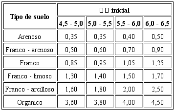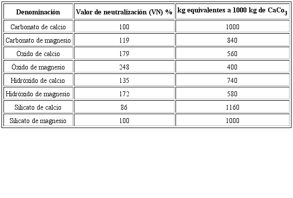 La Tabla 3 muestra los valores de neutralización de diferentes sustancias químicas empleadas para encalar.