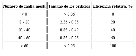La eficiencia agronómica del material para encalar depende del tamaño de la partícula, mientras más pequeña sea ésta, mayor será su reacción. Por lo que su eficiencia relativa (ER) va a depender del grado de molienda del material 17,18. La Tabla 4 muestra esta relación.