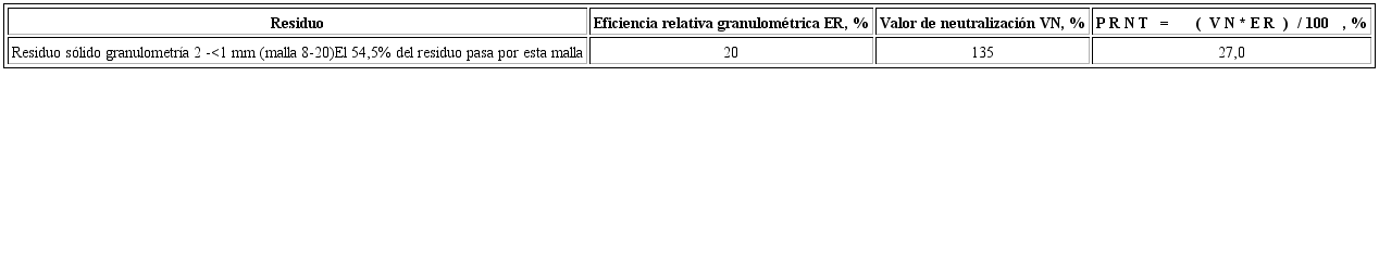 Para valorar de forma conjunta estos dos factores, la pureza química y el tamaño de partícula, se utiliza un parámetro denominado Poder Relativo de Neutralización Total (PRNT). Este valor indica la cantidad de material que reaccionará en los primeros tres meses 17 y se calcula de acuerdo a la ecuación 1.