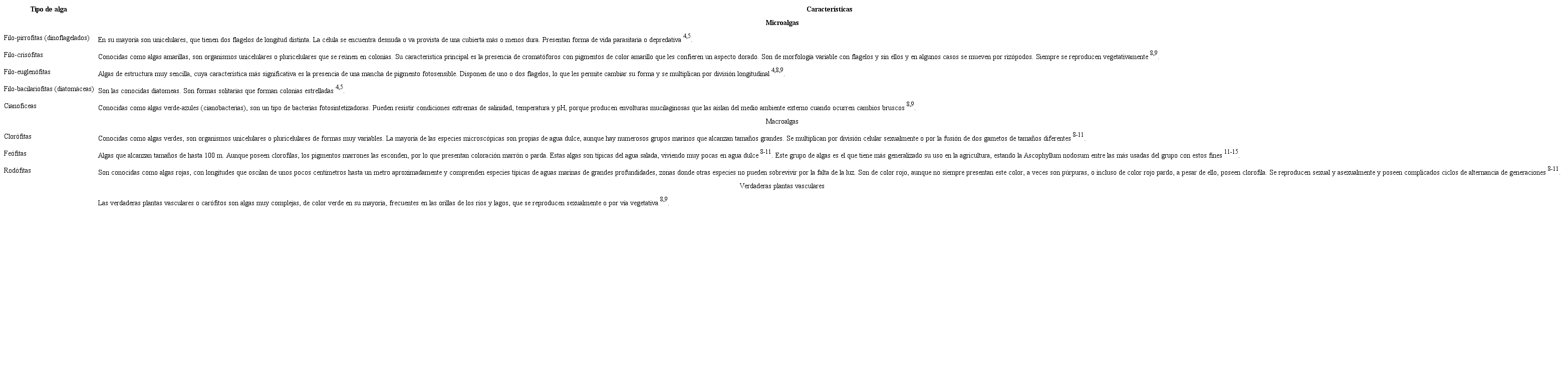 Existen algunas diferencias en cuanto a la clasificación de las algas; no obstante, de forma general se pueden dividir en tres grandes grupos: las microalgas, las macroalgas y las verdaderas plantas vasculares, las cuales a su vez se subdividen en diferentes grupos (ver Tabla 1) 4,5,10-13.