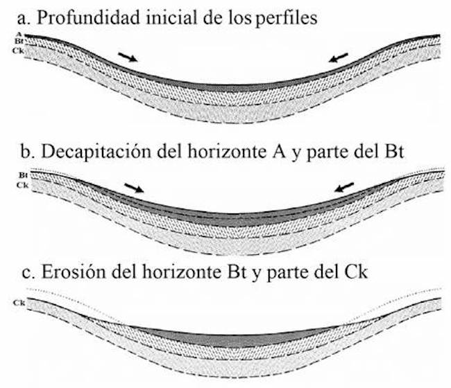 Se tomó como referencia el perfil C1(Sin erosión aparente)9, localizado en un área en biostasia, con una profundidad inicial del horizonte A0-490 mm, para evaluar en los diferentes períodos la magnitud de pérdida de los suelos Ferralíticos Rojos.