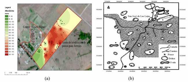De la misma manera, resulta notable la pluralidad de otras formas kársticas superficiales, como afloramientos de calizas de diámetros muy variables, carsolitos desde apenas unos centímetros hasta de 0,50 m (incluso mayores), lapiaz cubierto con depósito proluvio-deluviales, uvalas (con ponores funcionales), sumideros; entre otras, que desempeñan un importante papel en el ámbito del polje, dada su capacidad para colectar, transformar o drenar las aguas superficiales y subterráneas, condicionadas por la evolución espacio-temporal de la cobertura edáfica, que modifican la dinámica del medio e interfirieren con dichas interdependencias, resultado que coincide con investigaciones similares 52,53.