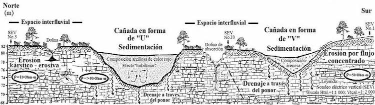 Resulta igualmente manifiesta la presencia de cañadas kársticas con valles en formas de "U" y “V” que a modo de barreras geomorfológicas se disponen en sentido transversal al declive general que muestran las vertientes (Figura 3), interceptando el escurrimiento, así como los productos de la erosión (suelos y rocas), los cuales por esta vía resultan redistribuidos por toda la región.