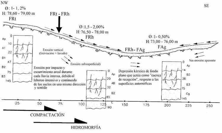En cambio, en otros sectores del polje estas acciones no se expresan de manera tan evidente y se limitan a las flexuras convexas del relieve (Figura 4), que subrepticiamente favorecen el desprendimiento y remoción areal de las fracciones más finas de los suelos, a un ritmo directamente relacionado con el escurrimiento difuso 37,38, que en unos casos se une de manera directa en la red de drenaje, mientras que en otros se incorpora a las efímeras cañadas kársticas de "heterogeneidad organizada", donde pueden residir un tiempo prolongado, según los casos, hidrodinámica que diferencia claramente a estas regiones de cualquier otra 39.