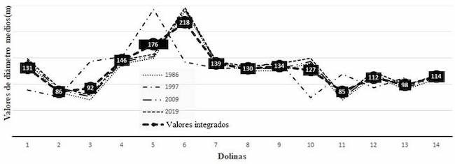 El incremento de las dimensiones morfométricas de las dolinas durante los años 1986-2019 (Figura 5 y Tabla 2), permiten confirmar que se desarrolla un proceso o modalidad erosiva inherente a los suelos Ferralíticos Rojos, denominada erosión subsuperficial, como resultado de la remoción de éstos hacia las cavidades kársticas, cuya manifestación más evidentes resulta la amplitud de su diámetro medio (DM) a expensas de la reducción de los espacios interfluviales o “dolinización”, con marcada tendencia hacia el endorreísmo con una irreversibilidad de la karstificación en su evolución unidireccional 1,40.