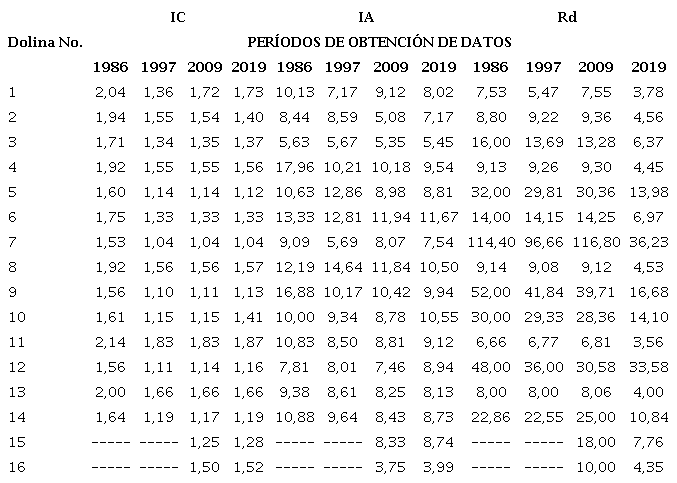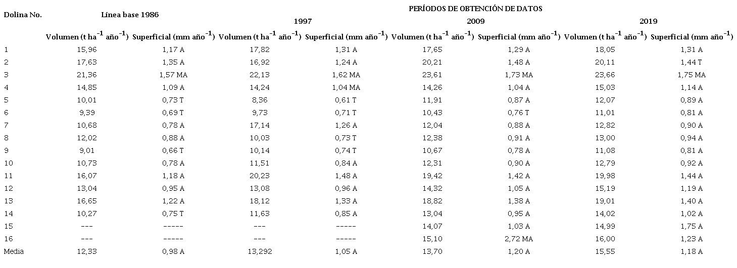 No obstante, es de destacar que a inicios de la década de los años 90 del Período Especial o de crisis económica en Cuba, cuando las actividades agropecuarias en el polje quedaron paulatinamente inhabilitadas, comenzó una regeneración natural con especies “cicatrizadoras” tales como marabú (Dichrotechys glomerata), aroma (Acacia farmesiana) y palmas (Roystonea regia), que actuaron como un barbecho inducido y que propiciaron cierta resiliencia o estabilidad morfoedafológica en los procesos kárstico-erosivos 50,51, favoreciendo la recuperación edáfica con alguna independencia del valor energético del relieve, aspecto que se refleja en la ralentización de los parámetros morfométricos de las dolinas (Tabla 2), así como en los volúmenes de pérdidas con sus respectivos valores de equivalencia de remoción superficial, en especial durante el año 1997 (Tabla 3).