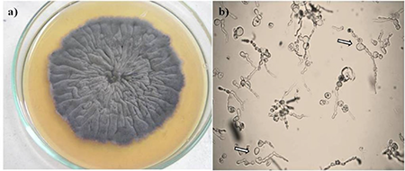 Los resultados de la caracterización cultural y morfológica de la cepa HR5E3 se presentan en la Figura 1: la colonia, circular, desarrolló bordes irregulares con relieve, de textura aterciopelada y coloración negra grisácea, debido a la abundante producción de clamidosporas (Figura 1a) (20); las hifas, septadas, presentaron hinchazones redondeados y próximos a las septas (Figura 1b). El tamaño promedio de los conidios fue de 8-10 × 4-5 μm, con forma piriforme o “de pera” (Figura 1b)