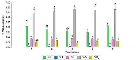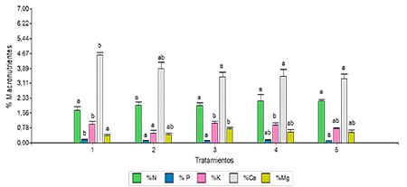 En el segundo año de estudio los contenidos de N fueron bajos (2,3-2,5 %) en los tratamientos 3 y 4, óptimos (2,51-2,80 %) en el tratamiento 2 y en exceso (˃3 %) en los tratamientos 1 y 5. Solo se ve diferencia significativa entre el tratamiento 4 y 5. Los niveles de P se encontraron entre valores bajos (0,10-0,12 %) a óptimos (0,13-0,16 %), el K entre niveles óptimos (0,71-1 %) a altos (˃1,30 %) y el Ca en niveles altos (5,10-6,50 %) sin diferencias significativas entre tratamientos, mientras que el Mg presentó valores altos (0,46-9 %), diferenciándose el tratamiento 1 del 2 y 5 (Figura 2).