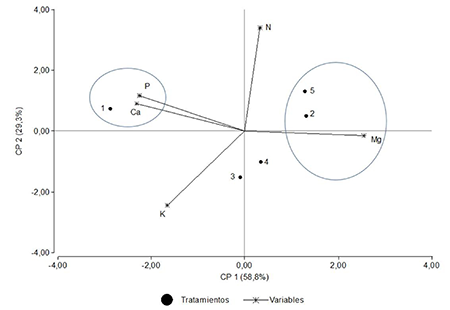 El Análisis de Componentes Principales (ACP) y Biplot de las variables nutricionales analizadas y la fertilización con nano partículas de Dolomita explicaron en dos componentes el 88,1 % de la asociación entre las variables. Las componentes principales 1 y 2 (CP 1, CP 2) representan el 58,8 % y el 29,3 % respectivamente, de la variación total (Figura 4).