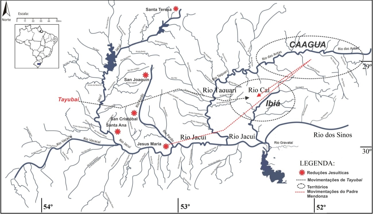 Tayubai, uma liderança espiritual Guarani contrária aos ensinamentos do cristianismo, tentou persuadir as parcialidades presentes em San Miguel a desfazer a aliança com os jesuítas (MONTOYA, 1985). Entretanto, estes indígenas não teriam acreditado em seu discurso e o capturaram para que o padre Cristóval de Mendonza o convencesse a aceitar o Evangelho. Por discordar das palavras do missionário, Tayubai escapou de San Miguel e estabeleceu-se em territórios do Ibiá, onde encontrou Mendonza, em 1635, conforme mapa (Figura 1), (CARTA..., 1969; MONTOYA, 1985).