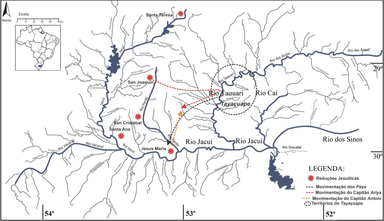 A análise da Carta Ânua de 1635 possibilitou identificar dois casos em que parcialidades indígenas lideradas pelos Paye Guarani declararam guerra contra os padres, provocando conflitos com os jesuítas e com os Guarani reduzidos. A primeira situação ocorreu em 1635, quando o padre Cristóval de Mendonza12 adentrou os territórios próximos aos rios Tebiquari (Taquari), Mboapari (Antas) e Caii (Caí), conforme mapa (Figura 1), com o intuito de sondar a possibilidade de catequizar os grupos indígenas localizados nesta área.