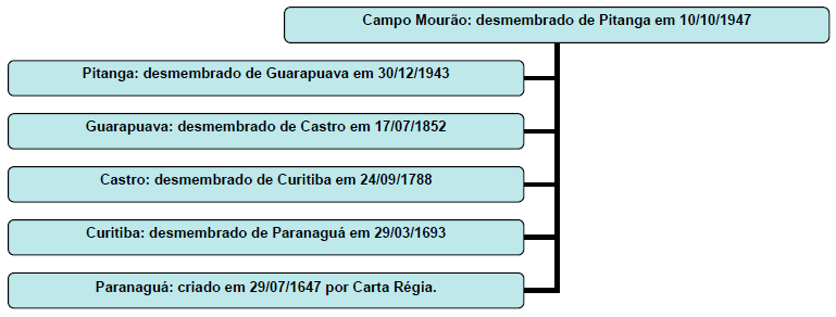 Notamos o caminho para a emancipação no organograma acima, com os desmembramentos políticos e um movimento de redução geográfica desde a criação de Paranaguá até a emancipação do município de Campo Mourão.