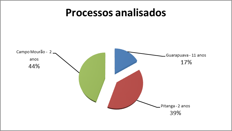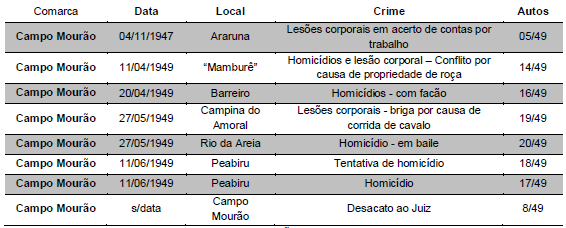 Os feitos delituosos alcançados pelos aparatos de poder judiciário no distrito de Campo Mourão sob jurisdição da comarca de Guarapuava, durante os anos de 1928-1939 (onze anos), representam 17% do total dos processos-crime da caixa de arquivo de número 1.