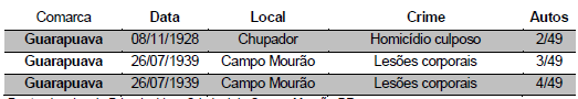 No arquivo da Primeira Vara Criminal, na caixa de n° 01 onde estão guardados os primeiros autos referentes aos feitos delituosos do território que viria a ser posteriormente a cidade, encontramos três processos-crime relativos ao distrito judiciário de Campo Mourão que, nesta época (1928-1939), estava subordinado à comarca de Guarapuava: