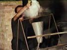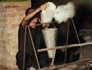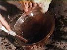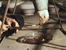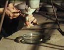 O rapaz entra num pequeno depósito de esculturas feitas de cerâmica. Ali também há alguns objetos rústicos de metal. Senta-se no chão, prepara um funil de degola de frango e coloca um prato embaixo para receber o sangue. Ele retira a galinha da sacola e a acaricia por uns instantes, antes de colocá-la de cabeça para baixo no funil. A cena seguinte é grotesca, pois a câmera enquadra num close o momento da degola, com a navalha cortando o pescoço da ave, que não morre imediatamente. Acompanhamos o corpo da ave se debatendo enquanto o sangue escorre. Um close nos pés amarrados lembra situações de sacrifício e de tortura. No entanto, a aparente afeição do executor com o objeto de sacrifício faz lembrar as aproximações entre erotismo, religiosidade e violência. O ambiente extremamente cru, os objetos simples de metal e cerâmica remetem a tempos remotos, quando “a destituição (ou a destruição) que funda o erotismo era bastante sensível para justificar uma aproximação do ato de amor e do sacrifício” (BATAILLE, 1987, p. 14).
