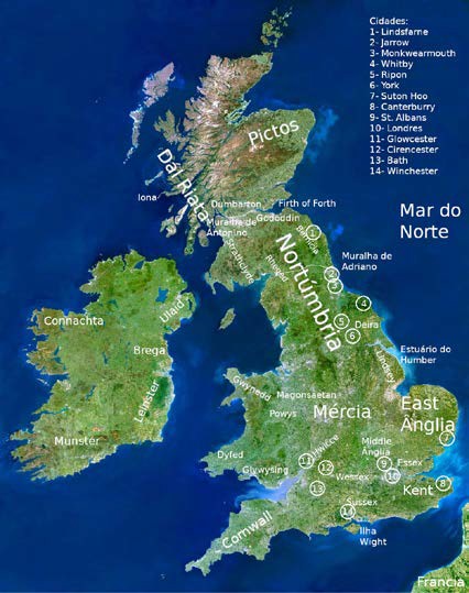 A menor travessia entre o Mar do Norte e a Grã-Bretanha era via Frísia, local onde supõe-se que muitos se reuniam para partir em viagem (YORKE, 2014, p. 74). Conforme Beda (HE, I, XV), a East Anglia, Mércia e Nortúmbria de seu tempo era habitada por “anglos”, enquanto os “saxões” estavam assentados em Wessex (West Saxons), Sussex (South Saxons), Essex (East Saxons) e Kent (ver Figura 2). Ainda que posteriormente esses povos fossem designados apenas “anglo-saxões”, diferenças entre eles são evidenciadas pela linguística (BOAS, 2016) e pela arqueologia.