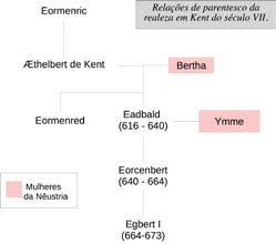 Em seguida, Eadbald (616-640), o filho de Æthelberht, após se desfazer de um casamento com a madrasta, com quem possivelmente Æthelberht se casara depois da morte de Bertha (BEDA, HE, II, V), também desposou uma franca. De acordo com Wood (2010, p. 449), a esposa de Eadbald, Ymme, ou Emma, tem sido identificada como a filha de Erchinoald, homem que se tornaria o prefeito merovíngio do palácio da Neustria. Erchinoald era o mais poderoso líder não-real da Francia, e seu período de atuação durou de 642 a 658. Enquanto Æthelberht se casara com uma merovíngia sem perspectivas, seu filho Eadbald, teria, de fato, se casado um membro de uma influente família franca. Isso denota que havia interesse de, no mínimo, duas gerações de merovíngios em estabelecer laços de matrimônio com os anglo-saxãos (possivelmente devido às relações comerciais entre ambos), conforme se vê no esquema da figura a seguir: