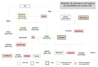 Durante o reinado de Oswiu, que foi uma figura proeminente até a sua morte, a Nortúmbria atingiu um dos seus pontos máximos de expansão. Os casamentos e as várias relações de parentesco citadas aqui são sumarizadas na Figura 4: