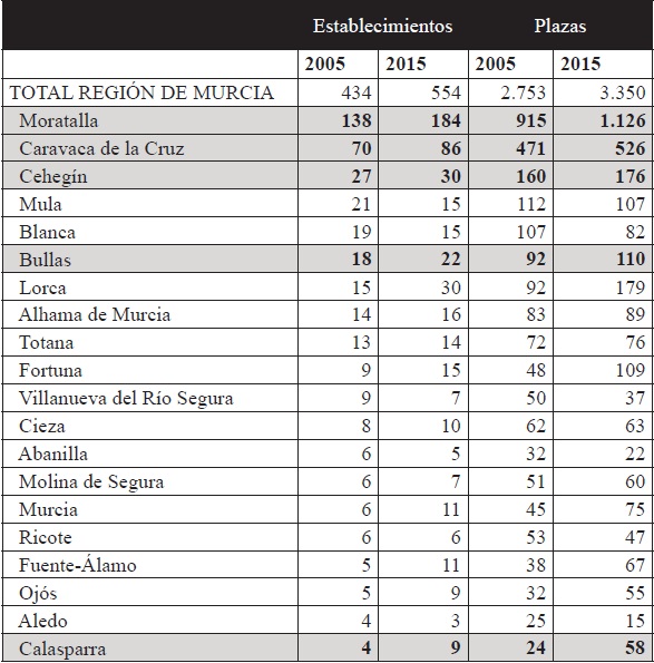 Conviene aquí realizar una observación respecto a Caravaca de la Cruz. El hecho de haber sido declarado por la Iglesia como uno de los 5 lugares santos de la cristiandad (junto a Roma, Jerusalén, Santiago de Compostela y Santo Toribio de Liébana), ha configurado una oferta turística más diversificada en este municipio, apostando por una promoción más exhaustiva del producto Religioso/Cultural, que incluso ha llegado a ferias internacionales de turismo como uno de los Grandes Proyectos Turísticos Integrados de la Región de Murcia.12 Por ello, las modalidades de alojamiento disponibles se adecuan, en mayor medida, a las necesidades de la demanda que elige este destino turístico y el municipio cuenta con 6 hoteles que proporcionan 225 plazas.