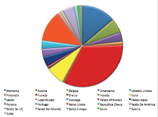 Con respecto a las pernoctaciones de los no residentes en España no resultan demasiado significativas, como puede observarse en la figura 15. Sería de gran interés mejorar este aspecto porque el gasto de los turistas extranjeros (58,24€), es más elevado que el de los nacionales de otras Comunidades, (36,13€). Destacamos que franceses, alemanes e ingleses, por este orden, son los visitantes extranjeros que han realizado más pernoctaciones.