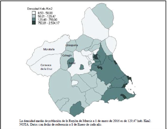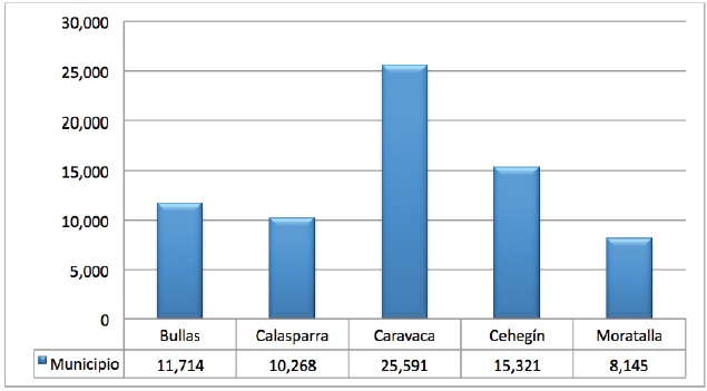 Con 71.039 habitantes, distribuidos en cinco municipios: Bullas, Calasparra, Caravaca de la Cruz, Cehegín y Moratalla (figura 2), presenta una densidad que, en el caso de Moratalla, sólo alcanza 8,5 hab/km2, frente a los 129,47 del conjunto regional y, sobre todo, respecto a otras poblaciones de la Comunidad Autónoma, como Alcantarilla, que acogen más de 2.500 hab/km2 (figura 3).