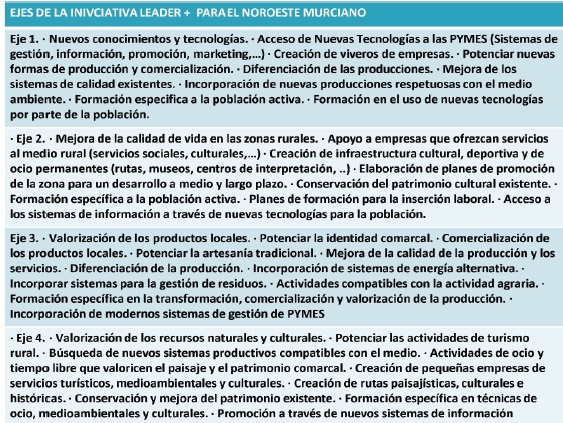 En LEADER 2007-2013 la labor de los Grupos de Acción Local se articula mediante las actuaciones incluidas en el Eje 3 del Programa de Desarrollo Rural de la Región de Murcia (PDR en adelante). Dicho Eje aborda la mejora de la calidad de vida en las zonas rurales y el fomento de la diversificación de la economía rural y, tras las fases anteriores, esta supone la transformación del LEADER porque pasa de Iniciativa Comunitaria a ser un Enfoque mediante el que gestionar las medidas de los Ejes 1, 2 y 3 de los PDR.