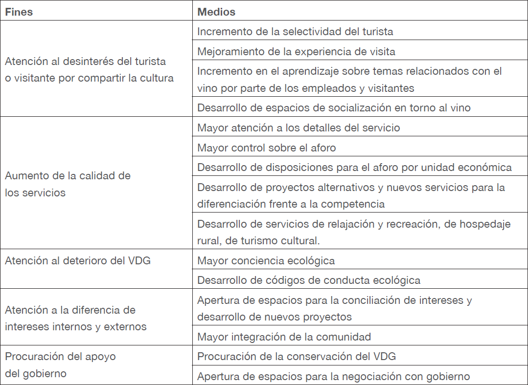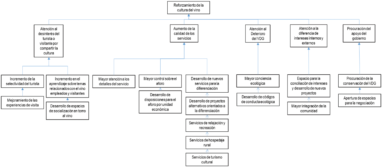 El objetivo principal de la investigación de la cual deriva esta comunicación se centró en identificar las buenas prácticas de enoturismo, necesarias en la región del VDG a fin de orientarse hacia una actividad turística sostenible en la región, para ello se establecen los aspectos que fortalecerán la cultura del vino, los cuales se destacan a partir del árbol de medios y fines: