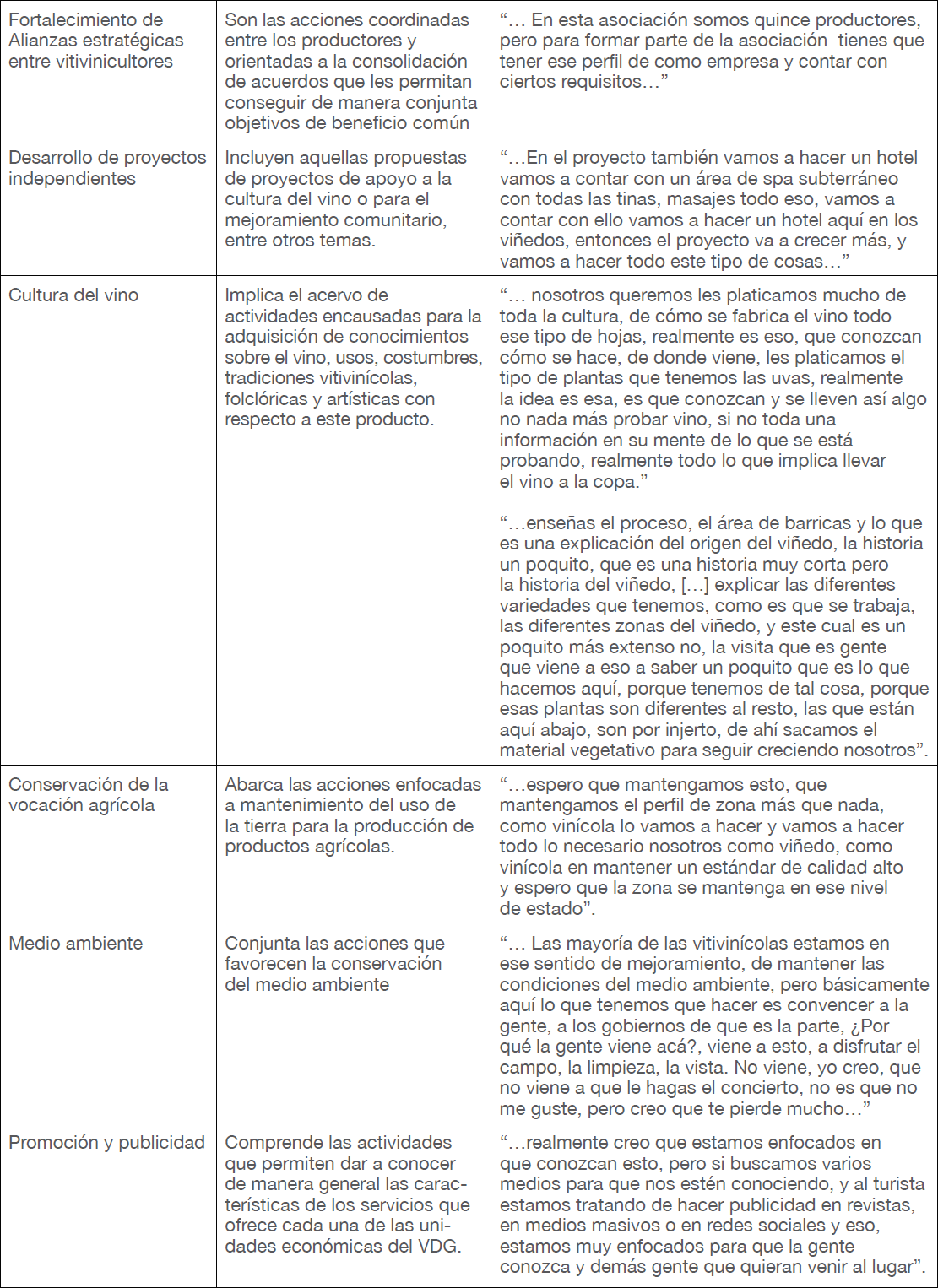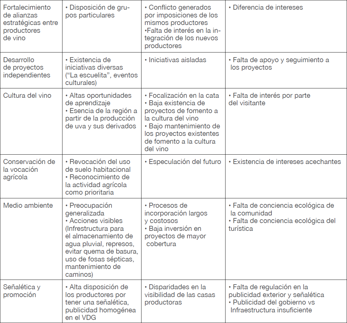 Estas buenas prácticas son resultado de las voces de los informantes cuyas frases se han propuesto para reforzar por un lado el compromiso de las diferentes unidades económicas, en asumir una postura frente al fortalecimiento de la cultura del vino en el VDG y por el otro, contribuir a la sostenibilidad y la conservación de la vocación agrícola en el VDG.
