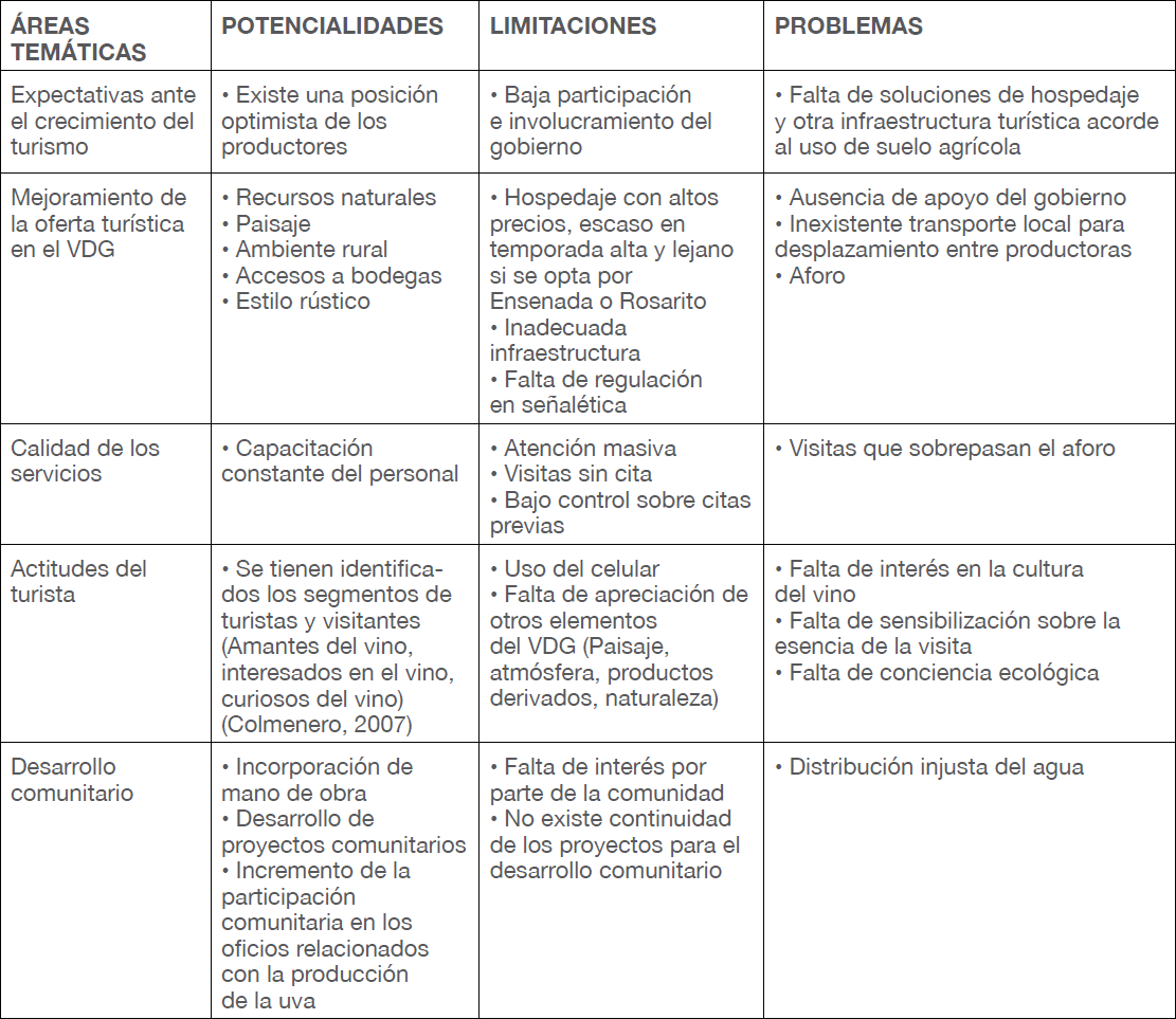 Sin embargo, el VDG está inmerso en problemáticas que ponen en riesgo la producción de uva, de vino y por ende el enoturismo como actividades esenciales de esta región. Entre los deterioros en el VDG se incluyen los ambientales y que son resumidos por Espejel et al., (2013) al mencionar aquellos relacionados con la escasez del agua, la sobre explotación de arena, el comportamiento tan variante de las lluvias, los incendios, el uso indiscriminado de pesticidas y fertilizantes, la compactación del suelo, las disminuciones de las superficies cultivadas, la contaminación del suelo, agua y aire.