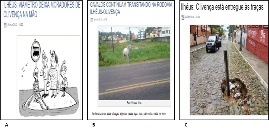 As informações obtidas por meio de blogs configuram-se como fontes secundárias (Freire, 1987) e auxiliaram no delineamento dos principais aspectos a serem investigados no distrito de Olivença. Por meio das reportagens e utilizando-se do critério de saturação, alguns problemas se apresentaram de forma recorrente, como é possível observar na Figura 1 que retrata a questão da falta de transporte, animais soltos na rodovia e ruas esburacadas.