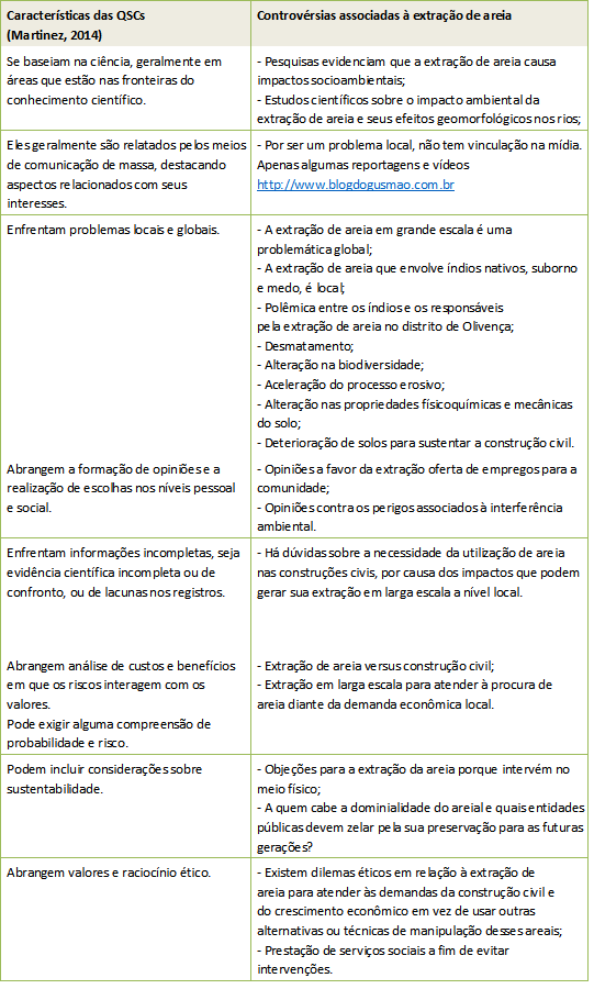 Além disso, as características das QSCs apresentadas por Martínez (2014) contribuem para legitimar que a controvérsia do Areial configura-se como sendo uma controvérsia socioambiental, uma vez que envolve “cientistas, decisores políticos e grupos de cidadãos” (Reis, 2009, p. 10), expondo suas diferentes percepções em relação, por exemplo, ao impacto ambiental de algum empreendimento.