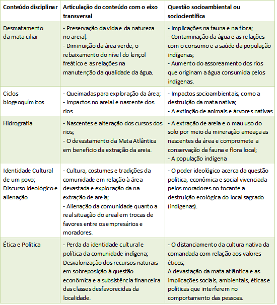 A partir dessa controvérsia delimitou-se o título da QSC como “Extração ilegal de areia: Impactos x Benefícios”. Por conseguinte, iniciou-se a escolha de conhecimentos e ações envolvidos nesta QSC, que pode ser abordada em diversas áreas do conhecimento. Para tanto, utilizou-se como parâmetro para a organização dos conteúdos – que contribuirão para o entendimento e tomada de decisões dos educandos acerca da QSC – a sua articulação com o eixo transversal. De acordo com Benítez, Morales e Mora (2015), esse eixo consiste nas relações existentes entre o tema, no caso Areial, e os problemas que envolvem esse tema, a exemplo de areial-vida, areial-desmatamento, areial-rios. A partir desse fato é possível estabelecer conteúdos necessários para discutir sobre este eixo, como ilustra o Quadro 2. No caso de areial-rios, por exemplo, faz-se necessário a discussão de conteúdos relacionados com a hidrografia, para que os educandos possam compreender como acontece a formação dos rios e como a extração de areia de forma irregular pode prejudicar as nascentes.