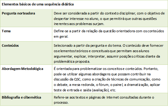 Elaborou-se uma proposta de sala de aula a partir da QSC identificada no distrito de Olivença, para alunos da EJA (Eixo II), na disciplina de Ciências da Natureza. Tratase de uma sequência de aula elaborada tendo como referência elementos básicos a serem trabalhados no contexto de uma QSC, apresentados por Benítez, Morales e Mora (2015), conforme ilustra o Quadro 3:
