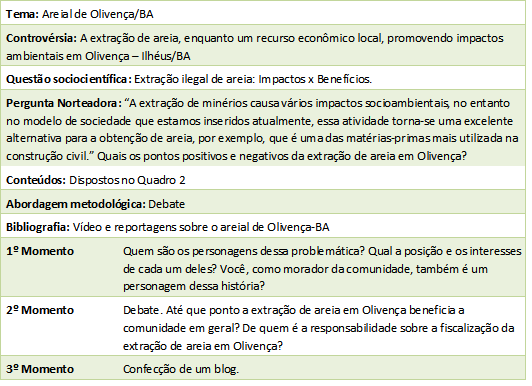A organização do Quadro 1 também auxiliou na escolha do título da controvérsia que é “A extração de areia, enquanto um recurso econômico local, promovendo impactos ambientais em Olivença – Ilhéus (BA)”. Analisando o Quadro e a controvérsia delimitada, elaborou-se a pergunta que norteará o planejamento didático-pedagógico, que é “A extração de minérios causam vários impactos socioambientais, no entanto no modelo de sociedade que estamos inseridos atualmente, essa atividade torna-se uma excelente alternativa para a obtenção de areia que, por exemplo, é uma das matérias-primas mais utilizada na construção civil. Quais os pontos positivos e negativos da extração de areia em Olivença?”.