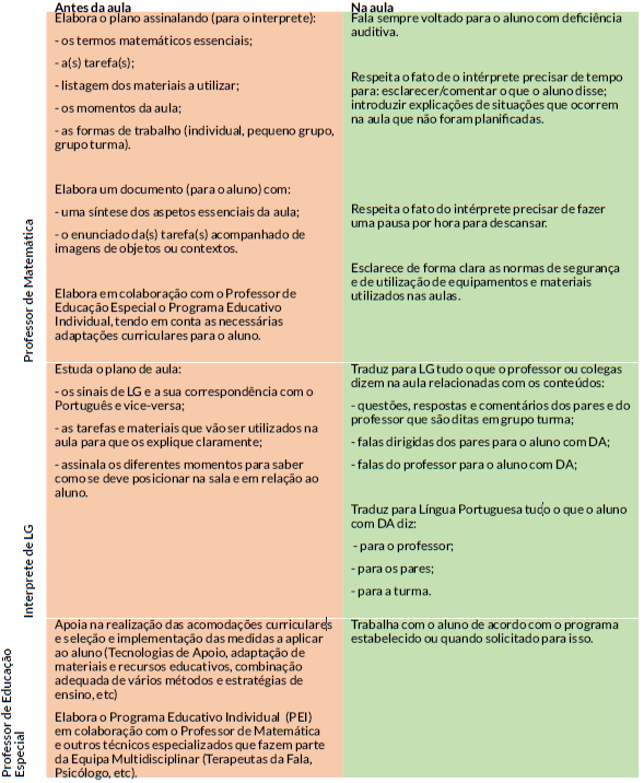 As escolas de referência para a educação bilingue integram docentes com formação especializada em educação especial na área da surdez, docentes de LGP, intérpretes de LGP e terapeutas da fala que em colaboração com os demais professores do ensino regular constituem a equipe multidisciplinar, garantindo o acesso à informação e ao currículo, designadamente através de equipamentos e materiais de suporte visual às aprendizagens. Embora todos esses profissionais contribuam para a educação dos alunos com deficiência auditiva, focaremos nas funções dos profissionais que têm uma atuação mais direta na sala de aula de Matemática.