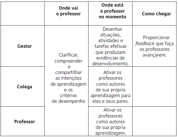 Sendo que a avaliação formativa do desempenho docente lida essencialmente com a regulação do processo de aprendizagem dos professores, uma forma de pensar sobre isso é que ela lida com três processos principais:
